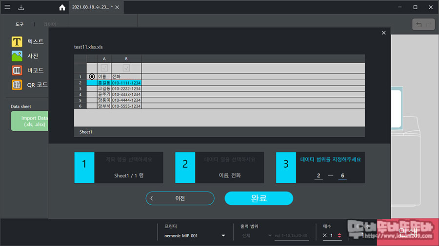 엑셀 파일을 불러와 사용하는 이 방법은 엑셀 파일의 대량의 정보를 이용하여 연속 프린팅을 하는 방식에 접합한 기능인데요.