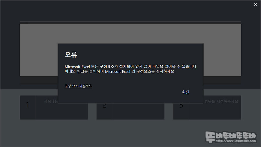왼쪽 메뉴의 Date sheet 항목에 Import Date (xls, xlsx)를 선택하여 양식으로 저장된 엑셀 파일을 불러오면 되는데 필자는 노트북에 사용하려고 구입한 오피스2019 홈앤스튜던트 Home&Student 2019 버전 때문이지 위 화면과 같은 메시지가 뜨면서 파일을 읽어올 수 없더군요.