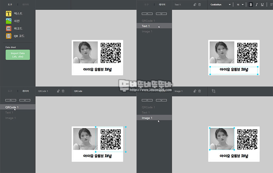 사진과 QR코드 그리고 텍스트를 혼합하여 작업하는 경우 도구 옆에 레이어 항목을 선택하여 각 개체를 선택 또는 잠금 휴지통 아이콘을 이용한 삭제로 다양한 화면 구성을 꾸밀 수 있으니 잘 활용하시기 바랍니다.