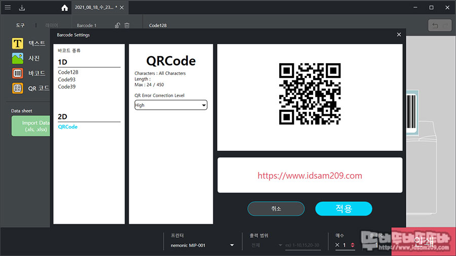 ▷ 바코드 메뉴에서는 일반적인 바코드와 QR 코트 생성을 지원하여 활용도가 좋은데...