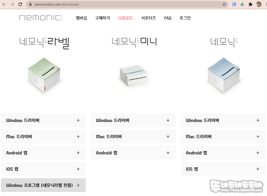 네모닉라벨 사이드 다운로드 메뉴 (https://nemonicbiz.com/download/)를 통해 Window 드라이버가 아닌 네모닉라벨 전용 Window 프로그램을 다운로드합니다.