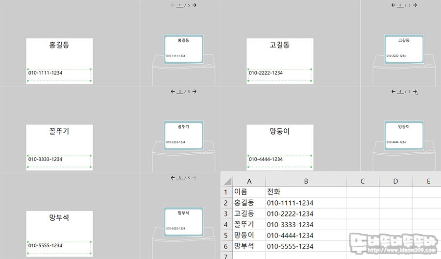 예를 들어 20명에게 DM 발송을 하는데 이름과 전화번호를 네모닉라벨로 출력하려고 할 때 적합한 방법으로 20명은 많을 거 같아 5명의 데이터를 활용방법을 설명드리겠습니다.