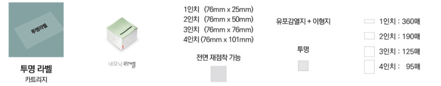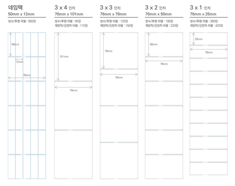 각 라벨은 네모닉라벨 가로폭 76mm (3인치)을 기준으로 세로 101mm (4인치) / 76mm (3인치) / 50mm (2인치) / 25mm (1인치)로 분류하고 있으며 라벨 특수성 (방수/투명/재점착/강점착)에 따라 사용할 수 있는 장수가 다르게 표기되어있습니다.