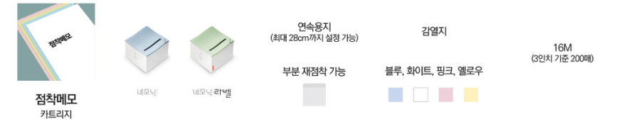최신 모델인 네모닉 라벨과 구모델인 네모닉 모델에 사용 가능한 점착 메모 카트리지는 포스트잇처럼 카트리지 오른쪽 끝 라인에 약간의 점착 라인을 형성되어 사용할 수 있는 라벨 카트리지로 라벨 크기가 정해지지 않은 연속 용지로 사용자가 지정한 용지 크기에 맞게 출력이 가능한 특징을 가지고 있습니다.