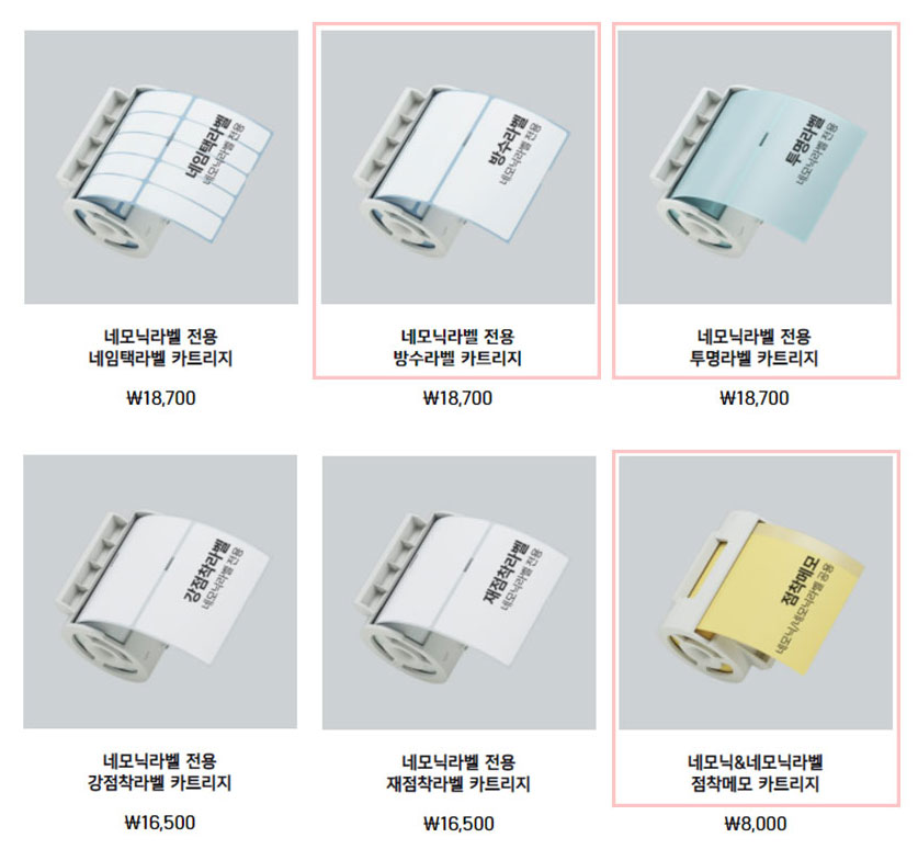 네모닉 쇼핑몰에서는 네임텍라벨 / 방수라벨 / 투명라벨 / 강점착라벨 / 재점착라벨 / 점착메모 카트리지 등을 확인할 수 있는데요.