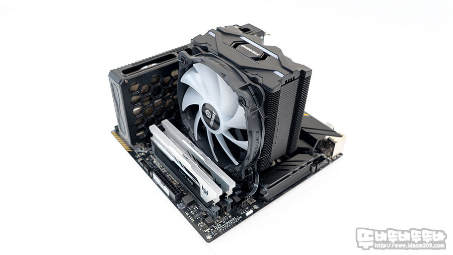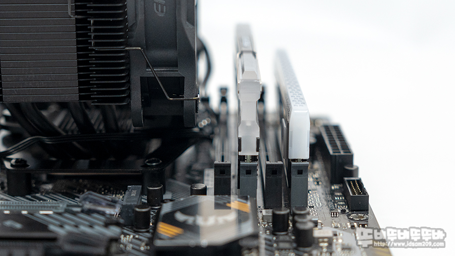 실제 시스템 조립 시 위의 사진과 같이 메모리 뱅크를 침범하지 않는 CPU 쿨러라면 조립하는데 큰 문제는 없으실 거에요.