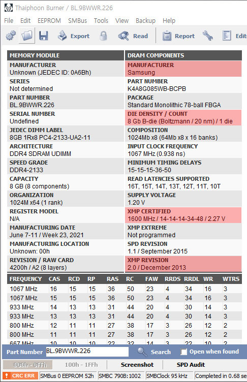 메모리 정보 타이푼 버너로 살펴보면 삼성의 B-die를 사용한 것을 확인할 수 있는데요. 제품 상세 설명에서 B-die를 사용했다고 홍보한 만큼 주 차별로 생산되는 모든 제품에 B-die를 선별하여 생산하는 느낌이 듭니다.