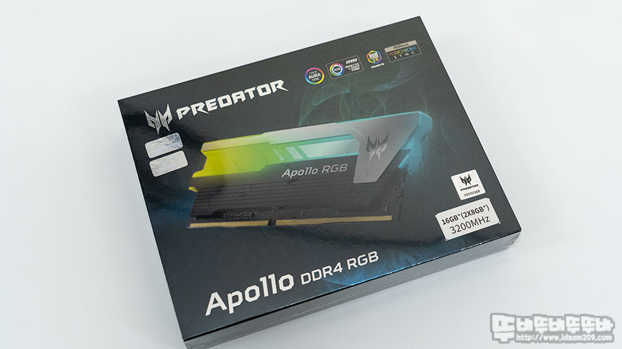에이서 프레데터 APOLLO DDR4-3200 CL14 APOLLO 메모리 고급스러운 코팅용지에 랩핑 처리로 밀봉된 패키지로 되어있으며 프레데터 로고와 APOLLO 제품 사진과 각 메인보드의 addressable RGB 지원에 대한 표시 그리고 메모리 클럭과 용량 정보를 확인할 수 있습니다.