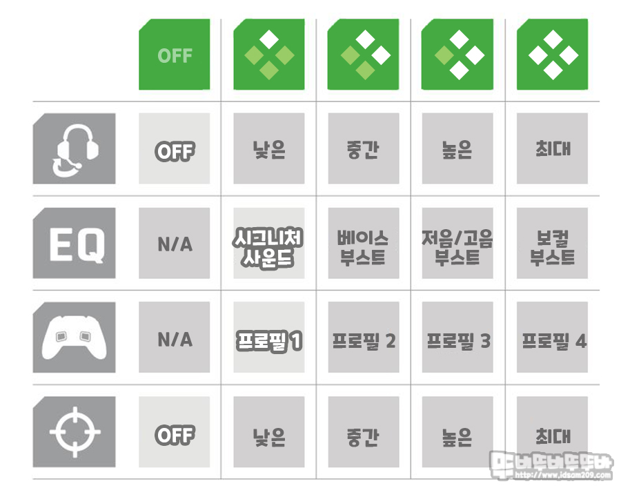 시그니처 사운드(기본값)/ 저음 부스트 / 저음 및 고음 부스트 / 보컬 부스트 여기에 슈퍼휴먼 히어링으로 파워풀한 게임일 사운드를 즐기실 수 있으니 꼭 헤드셋/이어폰을 연결하여 사용하시기 바랍니다.