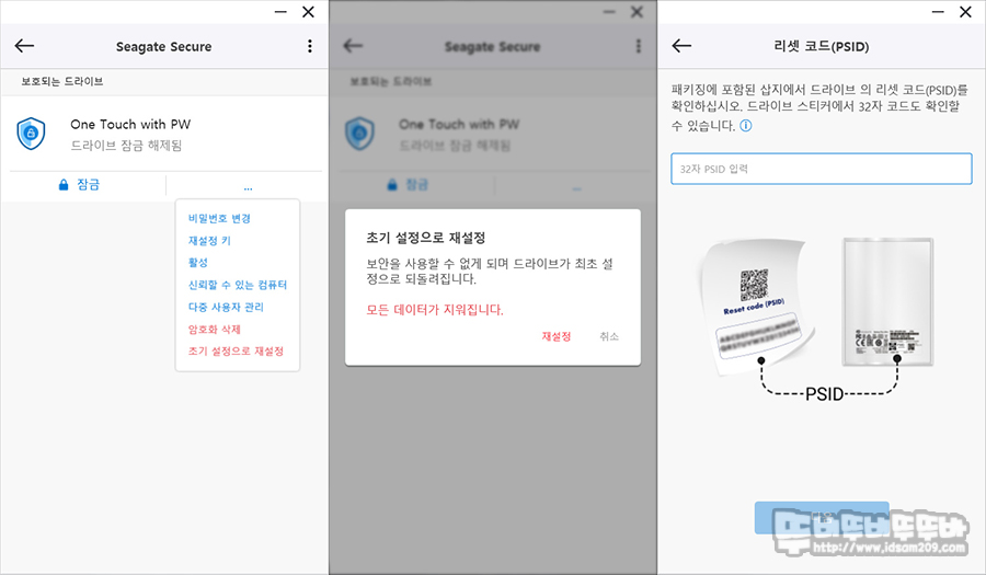 씨게이트 One Touch HDD의 암호화 삭제 및 초기화 진행 시 패키지에 동봉된 Reset code (PSID) 종이에 인쇄된 코드를 입력하여 진행하기에 구성품으로 제공하는 SID와 PSID가 적힌 종이를 분실하지 않도록 보관하시기 바랍니다.