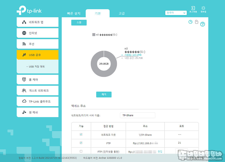 USB 메모리 연결 후 USB 공유 메뉴를 통해 192.x.x.x IP를 내부 접속, 124.x.x.x IP를 통한 외부 접속 설정과 MAC OS에서 지원하는 타임머신 기능도 사용도 가능하니 참고 하기기 바랍니다.