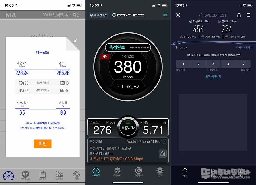 필자는 LG U+ 기가슬림 (500Mbps) 서비스를 사용 중이며 유선 속도 측정 시 기가슬림 서비스 속도와 양호한 무선 속도를 확인할 수 있었습니다.