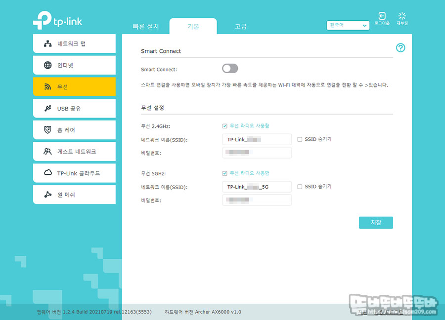 무선 메뉴의 Smart Connect는 무선 SSID가 2.4GHz/5GHz로 구분되어 보이는 게 아닌 하나로 보이면서 Band Steering 기능을 지원하게 되는데요.