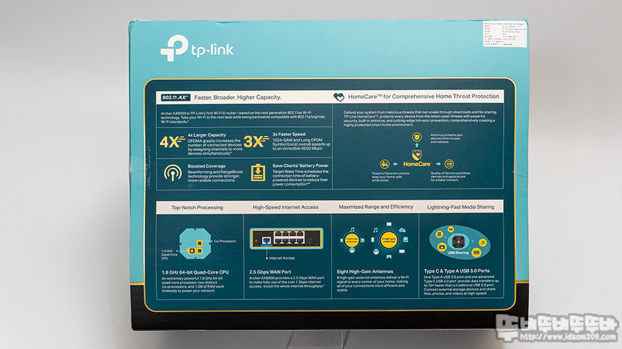 브로드컴 BCM4908 1.8 GHz 쿼드 코어 CPU 탑재 / 5GHz 4804Hz + 2.4GHz 1149Hz = AX6000 무선 속도 / RAM: 1GB / FLASH: 128MB / WAN: 1 포트( 2.5 기가비트) / LAN: 8 포트(1 기가비트) / USB 3.0 포트 2개 (USB-A, USB-C) / 2.4GHz, 5GHz 듀얼밴드 / 안테나 8개 / 모바일 관리 어플 / 빔포밍, OFDMA, MU-MIMO 지원 / 편리한 HomeCare 지원 등 성능과 편리성이 두루 겸비된 모델입니다.