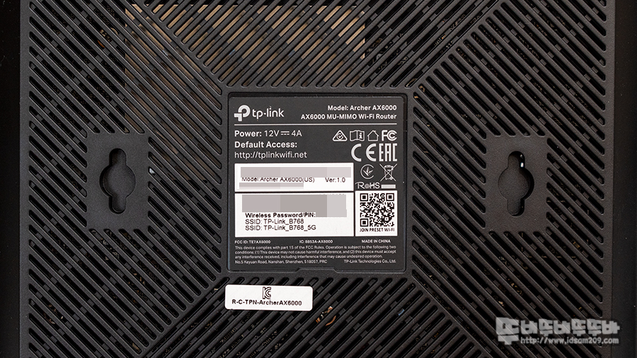 바닥면에는 초기 세팅 시 필요한 2.4GHz/5GHz Wi-Fi SSID와 비밀번호가 인쇄된 라벨과 양옆에는 벽면에 고정할 수 있는 마운팅 홀을 확인할 수 있으며 그 외 면적에는 발열 해소를 위한 통풍 홀이 적용된 디자인으로 시원시원하게 발열이 해소될 거 같은 느낌입니다.