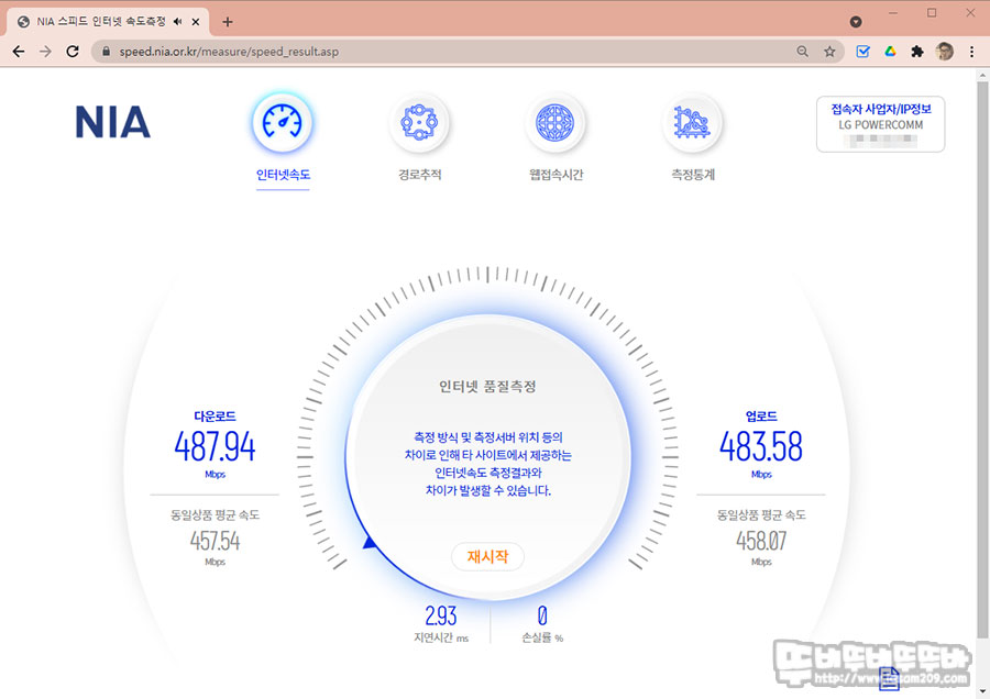 필자는 LG U+ 기가슬림 (500Mbps) 서비스를 사용 중이며 유선 속도 측정 시 기가슬림 서비스 속도와 양호한 무선 속도를 확인할 수 있었습니다.