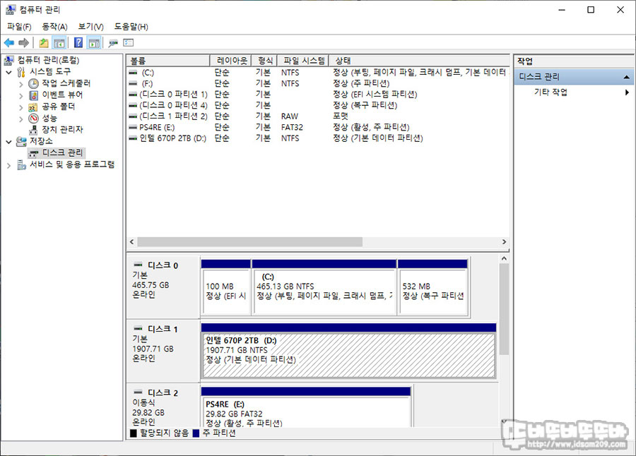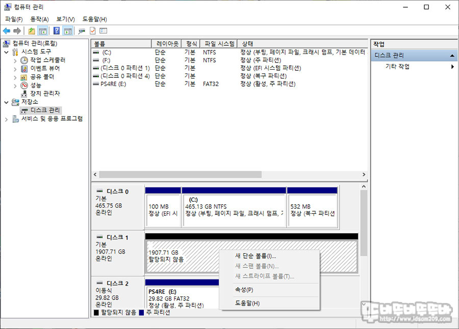 먼저 장착 후 디스크 관리자를 통해 사용할 수 있는 디스크로 만들어 줘야 하는데요.