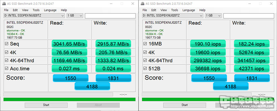벤치 프로그램마다 약간의 차이는 있지만 대부분 순차 읽기, 순차 쓰기 속도 모도 양호한 결과를 보여주기에 TLC NAND M.2 SSD와 비교해도 크게 부족하지 않은 편이네요.