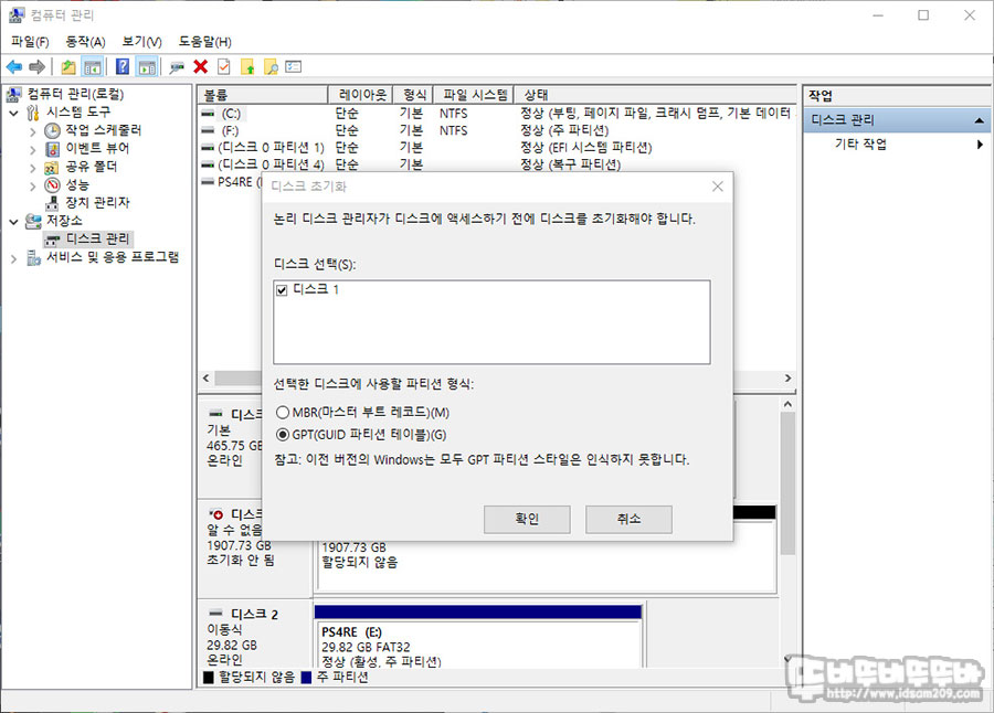 디스크 초기화 후 볼륨 생성으로 데이터 저장이 가능하게 작업을 해줍니다.