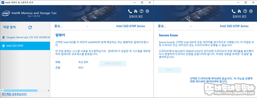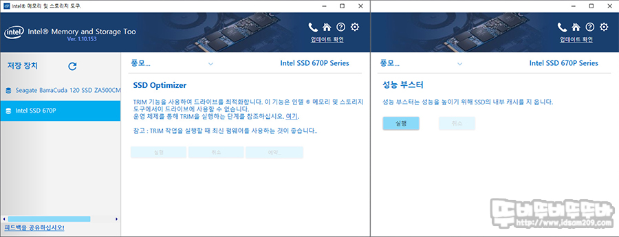 마지막으로 인텔에서 제공하는 SSD 전용 소프트웨어를 살펴보면 시스템에 장착된 인텔 670p 상태와 진단 스캔, 펌웨어 업데이트, 최적화, 데이터 삭제 그리고 내부 캐시를 제거해주는 성능 부스터 기능을 제공하고 있어 다른 디스크에서 파일을 가져오기 전 성능 부스터를 실행 주면 조금 쾌적한 속도로 파일 복사 가능합니다.