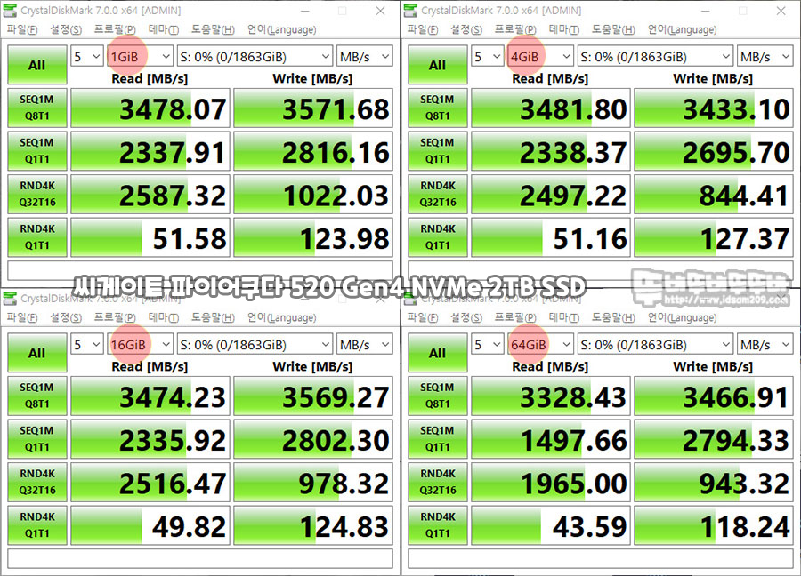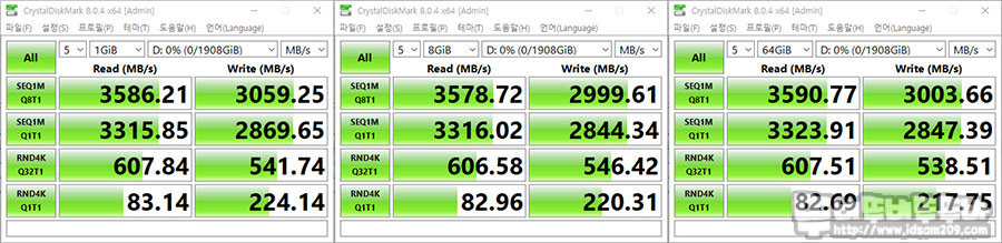 테스트 데이터 용량은 1GiB, 8GiB, 64GiB로 늘려가며 테스트를 반복하여도 준수한 속도를 보여주었습니다.