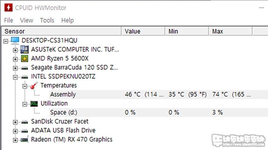 아이들 시 SSD의 온도는 38~46도 내외의 온도를 보여주지만 나래 온 더티 테스트 중 최대 74도까지 올라가는 것으로 보아 가급적 알루미늄 방열을 장착하여 사용해주시는 게 좋을 거 같습니다.