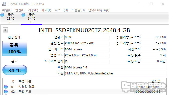 먼저 CrystalDiskInfo를 통해 제품의 정보를 확인 후 CrystalDiskMark로 벤치 테스트를 진행하였습니다.
