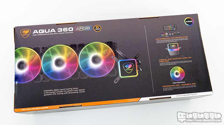 쿠거 AQUA ARGB 360 수냉쿨러 패키지에는 블링블링한 RGB LED 효과를 잘 보여주는 제품 이미지와 쿠거 로고와 AQUA 360 ARGB 모델명과 보증기간 5년, AURA SYNC, MSI MYSTIC LIGHT, GIGABYTE RGB FUSION, ASROCK POLYCHROME 등 메인보드 addressable RGB Sync 지원을 표기하고 있습니다.