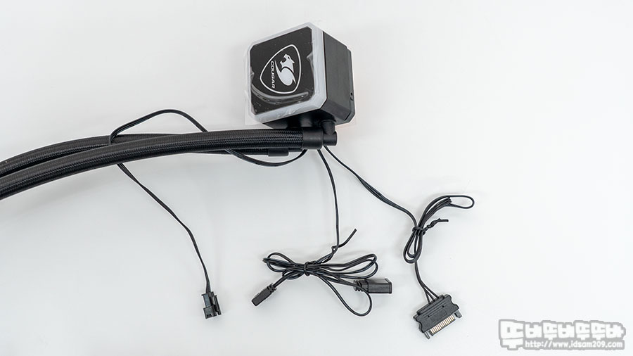 조금 독특한 부분이 있다면 쿠거 COUGAR AQUA ARGB 360 수냉쿨러의 워터블럭에는 SATA 전원 케이블이 추가로 구성되어있다는 점인데요.