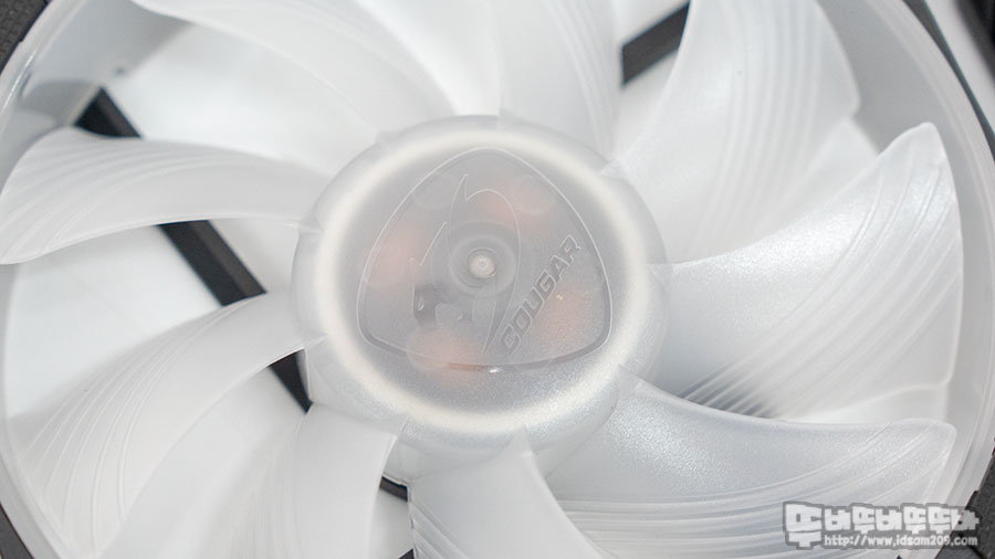 쿠거 VA 120 AGB 120mm 쿨러는 LED 투영을 위한 반투명 재질의 9개 블레이드로 구성되어있으며 블레이드에는 바람의 방향을 집중해주는 가이드 홈과 중앙의 쿠거 로고 각인이 눈에 띕니다.