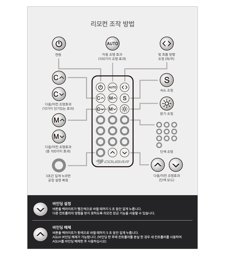 쿠거 COUGAR AQUA ARGB 360 수냉쿨러는 LED 라이팅을 컨트롤하는 리모컨을 제공과 100가지 이상의 RGB LED 라이팅 효과를 보여주는 기존에는 접하지 못한 독특한 수냉쿨러인데요.