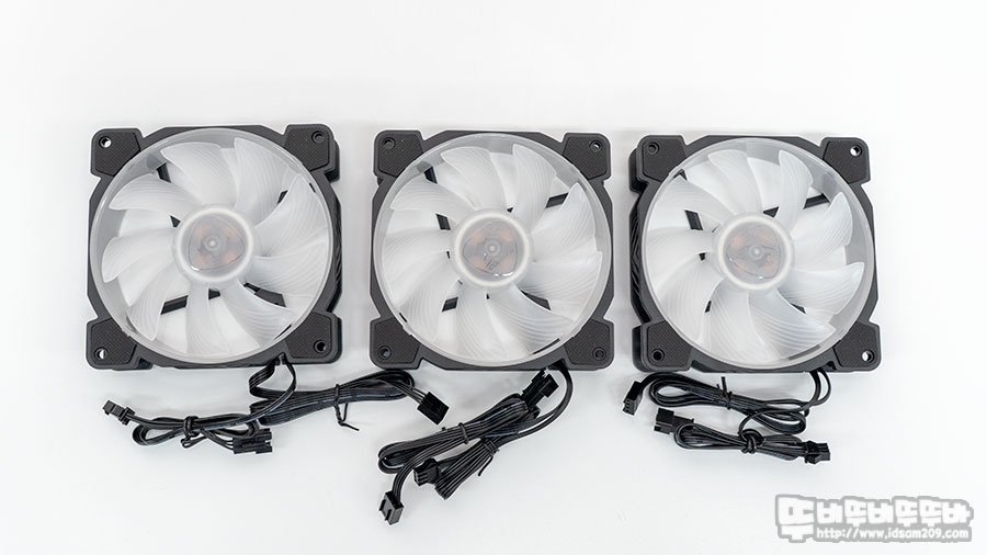 총 10가지를 지원하는 단색 RGB LED 효과는 워터블럭과 같이 연결된 쿨링팬 3개에 표현이 되며 프로그램을 이용하지 않는 리모컨 조작 방식의 편안함을 유지하기 위해서는 리모컨 분실을 주의하셔야 합니다. ^^