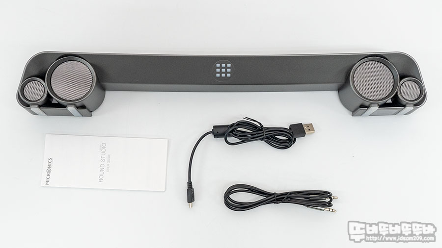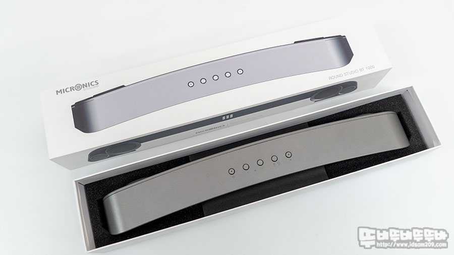마이크로닉스 ROUND STUDIO BT-1000 V2 블루투스 커브드 스피커는 450mm 길이의 바 타입 디자인으로 중앙에는 마이크로닉스 로고 모양의 LED 인디케이터와 양쪽 끝부분에 각 5W 출력을 지원하는 42mm 드라이브 유닛을 사용하였습니다.