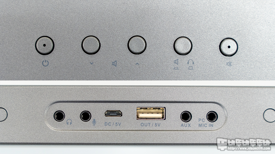 - 음성 출력 전환 버튼은 뒷면 I/O 포트의 AUX & MIC in 그리고 스피커 & 마이크 출력 포트기 모두 연결이 되어있는 경우 스피커와 헤드셋 출력을 전환이 가능하며 USB-A 단자는 내장된 배터리를 이용한 스마트폰 충전이 가능합니다.