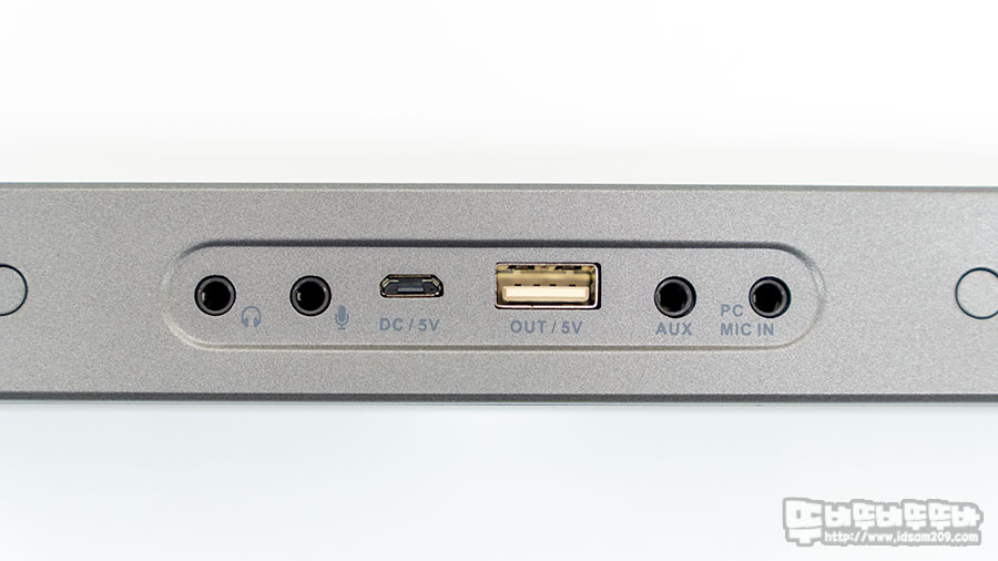 제품 뒷면의 I/O 포트는 헤드셋/마이크 출력 단자, MicroUSB 배터리 충전 단자, USB-A 전원 출력 단자, AUX 입력/마이크 입력 단자로 구성되어있으며 전면에 42mm 드라이브 유닛 후면에는 BASS 덕트 적용 그리고 바닥면에는 미끄럼 방지 패드가 사용되어 안정적인 사용을 지원하고 있는데요.