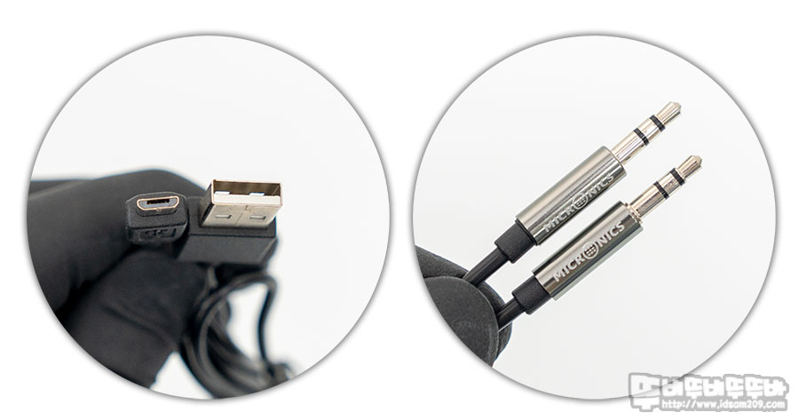 MircoUSB to USB-A 케이블과 스테레오 AUX 케이블의 모습.