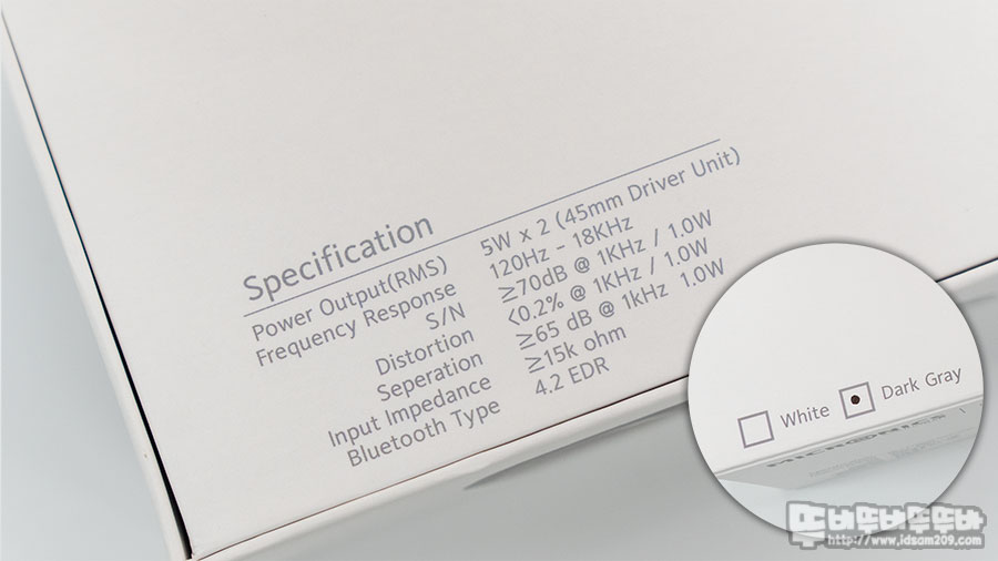 블루투스 버전 4.2+EDR / 드라이브 유닛 45mm 2개 / 출력 10W (5Wx2) / 18650 타입 2200mAh 리튬이온 배터리 내장 / 6시간 재생 / 크기 450 X 65 X 65mm / 무게 440g 그리고 제가 리뷰하는 제품은 패키지 측면에 표시된 Dark Gray 컬러입니다.