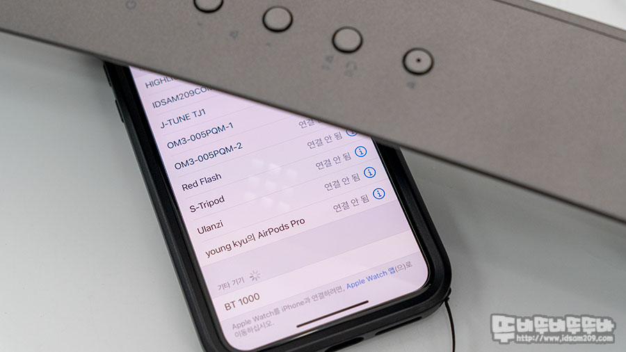 블루투스 연결 시 페어링 모드에서 스마트폰 블루투스 기기 리스트에서 "BT 1000"를 선택으로 페어링 후 사용하게 되며 상단의 볼륨 버튼을 이용한 볼륨/트랙 이동, 음 소거 버튼을 이용한 재생/일시 정지 기능을 사용할 수 있습니다.