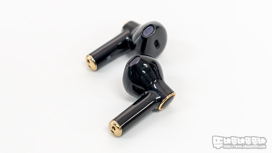 이어버드는 오픈형 디자인으로 골드 컬러 링으로 구분되는 터치센서 부분과 링 아래의 마이크, 스틱 아랫부분의 충전 접점을 확인할 수 있으며 스틱 안쪽에는 L, R 표기로 좌우를 구분하고 있지만, 오픈형 이어버드 특성상 모양만 보고도 구분이 가능합니다.