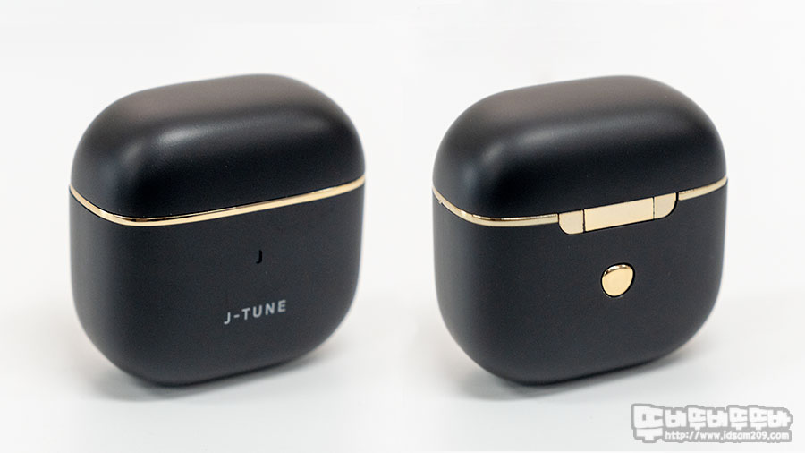 충전 케이스는 아담한 사이즈로 가로 5cm 내외, 세로 4.5cm 내외 작고 가벼운 편이며 전면에는 배터리 잔량 및 충전상태를 알려주는 LED 인디케이터 그리고 뒷면에는 배터리 잔량 버튼이 있고요.