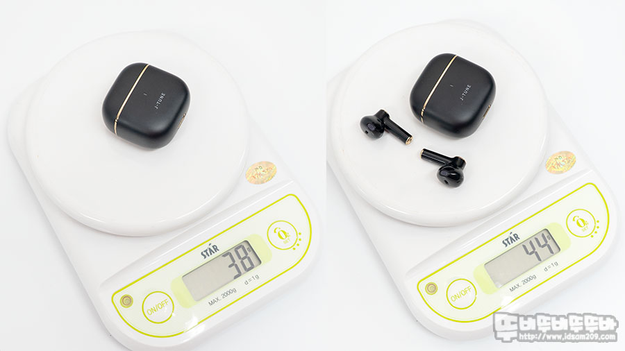 충전케이스는 약 38g 여기에 이어버드를 더하면 약 44g으로 휴대하기에 부담 없는 무게를 보여주고 있습니다.