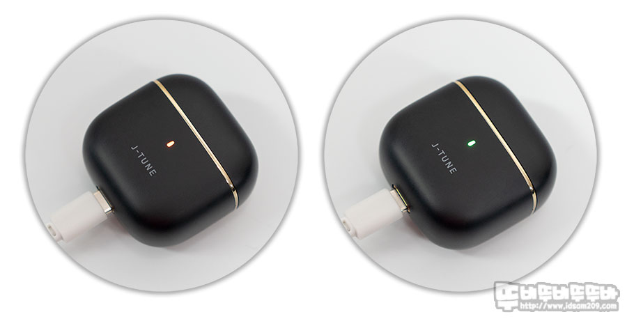 트리플제이 J-TUNE J10 블루투스 이어폰의 전면 LED 인디케이터는 충전 시 RED LED, 완충 시 GREEN LED로 표현되며 완충까지는 약 2시간, 이어버드 완충은 약 30분 소요됩니다.