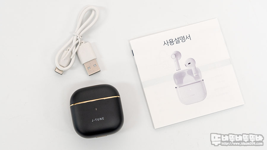 제품은 트리플제이 J-TUNE J10 블루투스 이어폰과 충전용 USB-C to A 케이블, 사용 설명서로 구성되어있습니다.