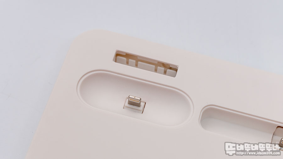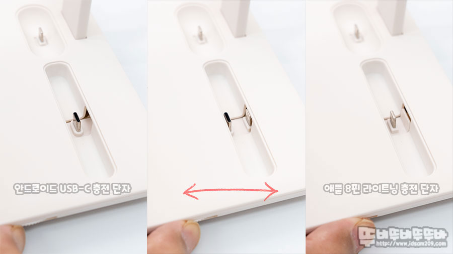 상단 오른쪽의 넓은 충전 홀은 애플 8핀 라이트닝 단자 또는 USB-C 단자를 겸용으로 사용할 수 있는 2 in 1 로테이션 시스템으로 디자인되었으며 우측면에 다이얼을 이용하여 충전 단자를 선택할 수 있고요.