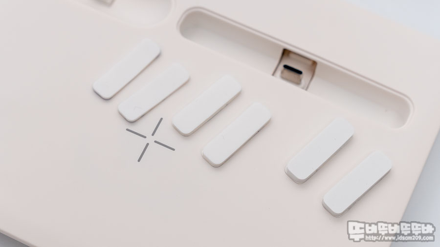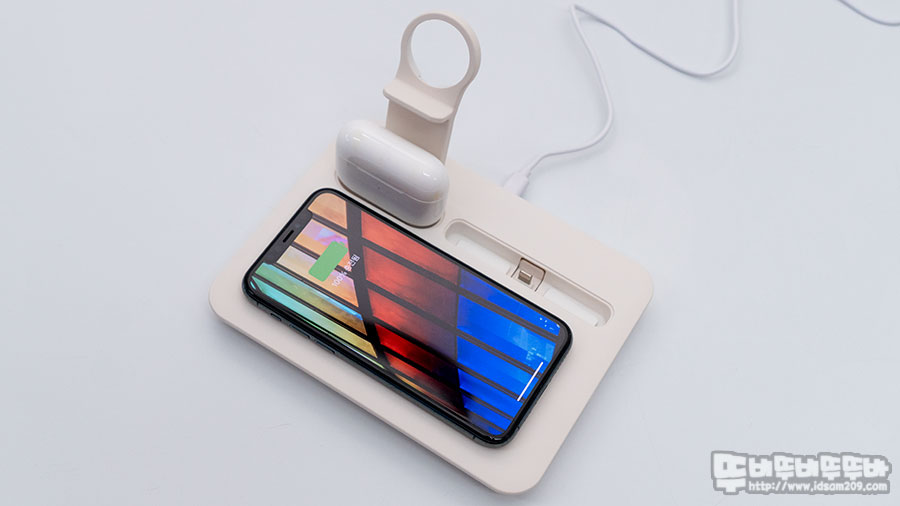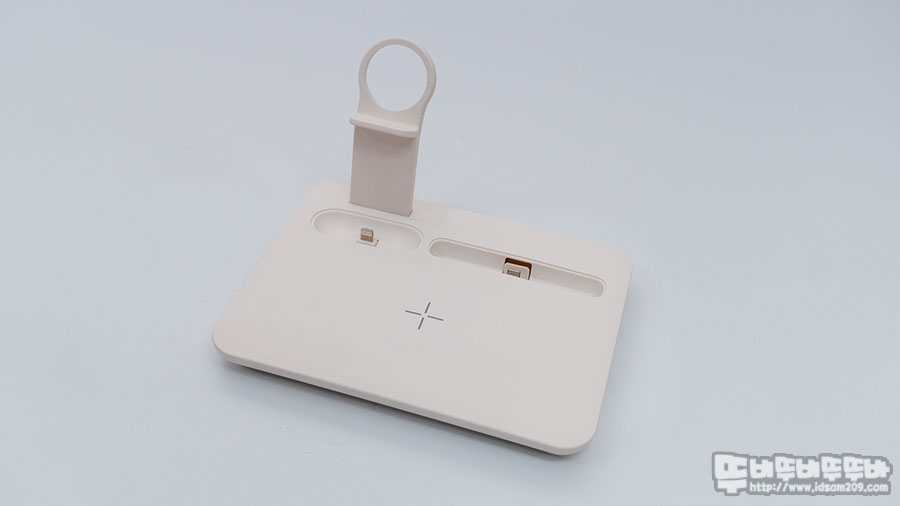 상단 왼쪽에는 에어팟 / 에어팟 프로 충전 단자 그리고 애플 워치 또는 삼성 워치를 충전할 수 있는 워치독 가이드 홀의 모습을 확인할 수 있습니다.