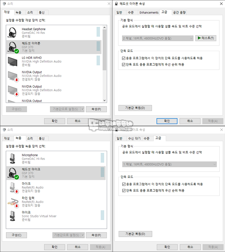 별도의 드라이버가 필요 없는 EPOS 젠하이저 GSP 370 무선 게이밍 헤드셋은 PC에 연결 시 기본 드라이버로 바로 사용이 가능하며 만약 소리가 들리지 않는다면 우선적으로 제어판 - 소리 설정 확인하여 "GSP 370 헤드셋"이 "기본 장치"로 설정되어있는지 확인하시고 이후에 동글이 연결 상태를 확인해보시기 바랍니다.