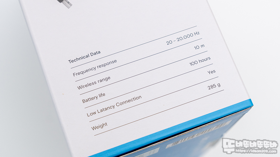 EPOS 젠하이저 GSP 370 무선 게이밍 헤드셋 패키지에는 제품의 실물 이미지가 인쇄된 모습에 제품의 모델명과 로우 레이턴시 및 100시간 배터리 타임을 지원하는 내용이 명시되어있습니다.