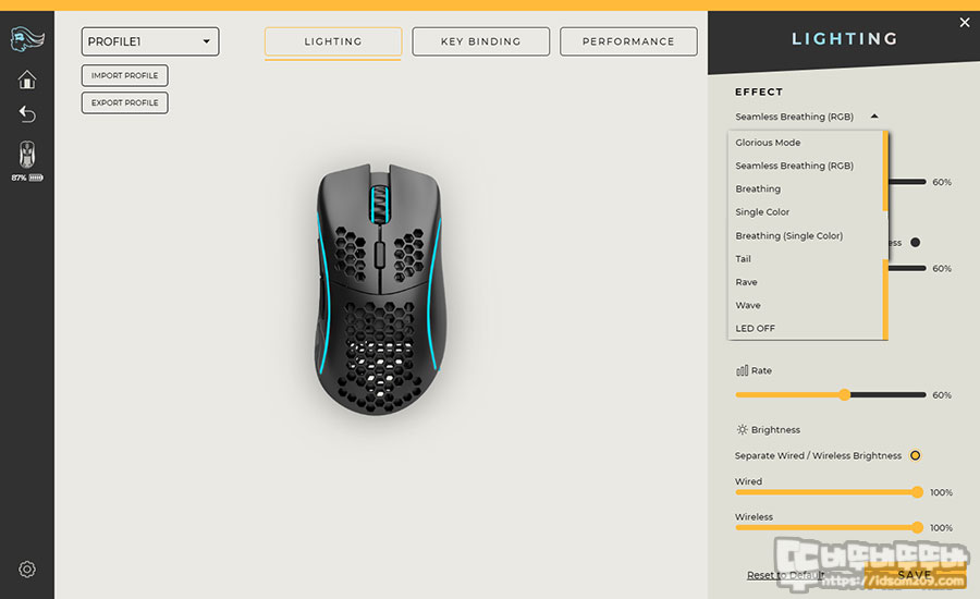 마지막으로 퍼포먼스 메뉴에서는 DPI 설정 최소 100에서 최대 19000 설정, USB 폴링레이트 125 / 250 / 500 / 1000Hz 지원, L.O.D 설정 1mm/2mm 선택 지원, 디바운스 타임 0ms~16ms 설정이 가능한데요.