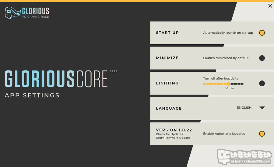 메인 화면 왼쪽 하단의 설정(톱니바퀴) 버튼을 누르면 볼 수 있는 화면에서는 Core 프로그램을 윈도우 시작 시 띄우기 설정, 최소화로 실행 설정, 일정 시간이 지나면 LED 라이팅 Off 설정 등이 가능하며 언어는 영문만 지원하기에 큰 의미는 없고 버전 업데이트는 주기적으로 진행이 되고 있기에 펌웨어 버전 여부를 확인하고 진행하시면 됩니다.