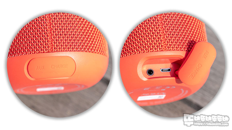 제품 뒷면 상단에는 스트랩 고리, 하단에는 방수를 위해 실리콘 커버로 덮여있는 AUX 단자와 마이크로 USB 충전 단자 모습을 확인할 수 있습니다.
